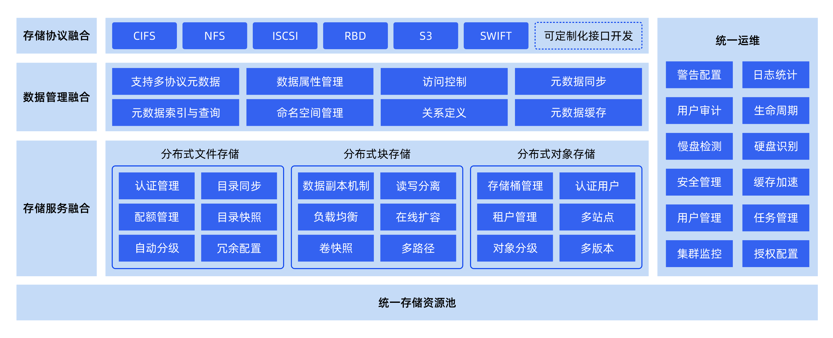 5. HPC高性能計算場景:在高性能計算領域,分布式融合存儲技術的應用作用愈發(fā)重要,它通過將多種存儲業(yè)務資源集成為一個整體,以滿足對文件、對象、塊功能的需求,以及性能和容量的要求,并提供高可靠性和可擴展性,為科學計算和數(shù)據(jù)分析提供了可信賴的數(shù)據(jù)基礎。